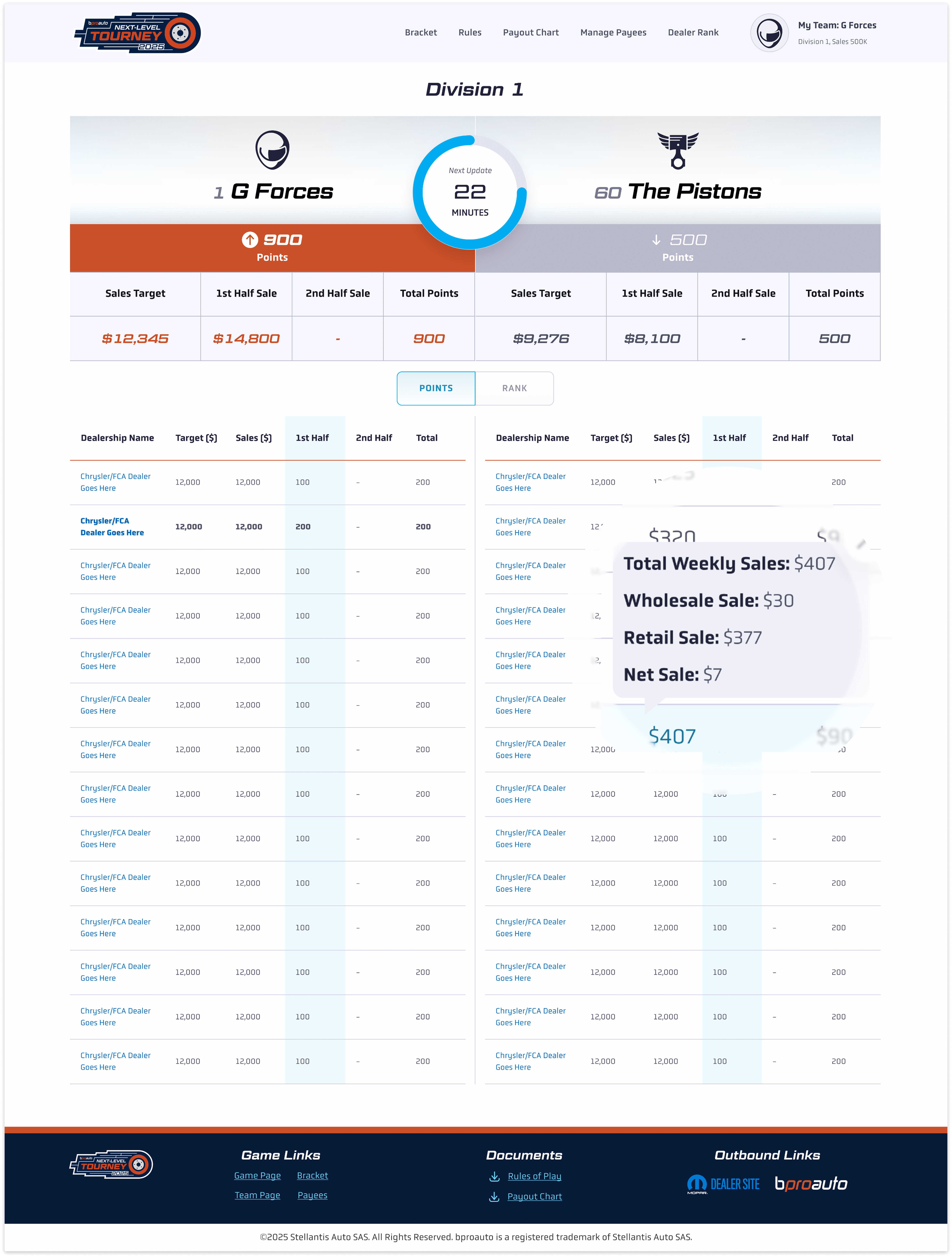 Dealers need to quickly understand their team's position, progress, and potential rewards, whether on personal devices or for team presentations. The bracket system transforms complex sales competitions into an engaging visual story. Using a familiar tournament layout, dealers quickly align with the mental model. It enables them to grasp competition status and incentives at a glance, serving as an effective tool for goal-setting and team motivation.